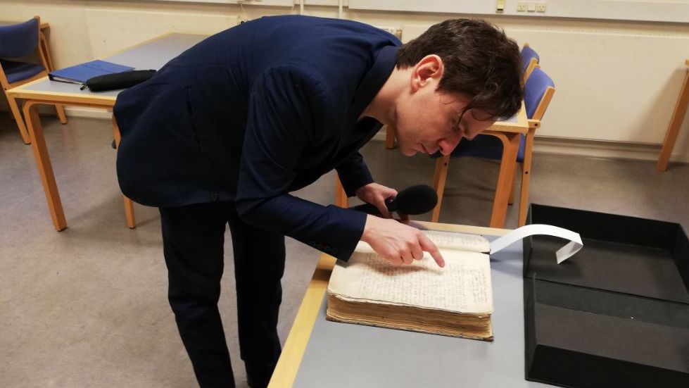 Finnur Koba kannar elstu tingbókina á Tjóðskjalasavninum.